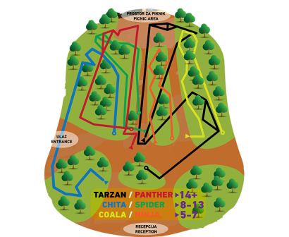 Tarzan Trail (black): the most challenging trail in the park, this course has 19 obstacles to overcome that go up to 15m the air. Leap like Tarzan and take a 100m cable downhill cable ride!
