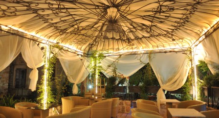 The impressive rooftop terrace is sheltered with a gauze-covered gazebo – fairytale romantic! |